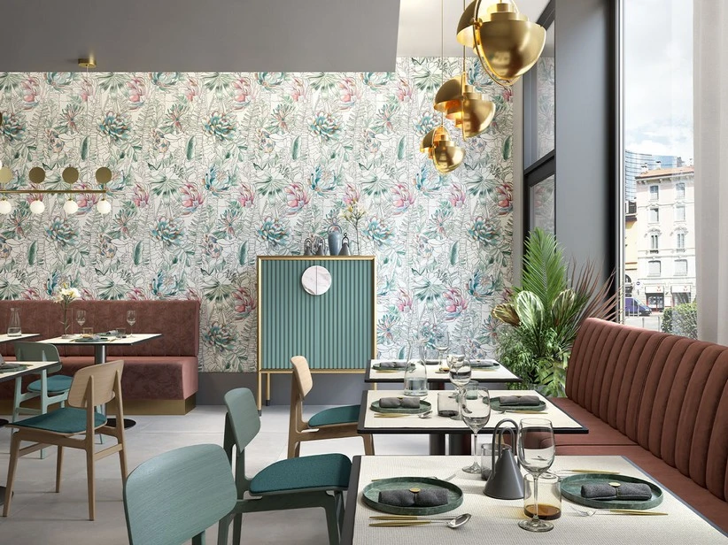 Composizione decorativa con effetto carta da parati su gres porcellanato sottile spessore 3,5mm.