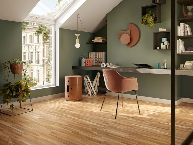 IPERCERAMICA propone un parquet nei toni naturali del rovere: le doghe hanno sfumature diverse, che vanno dal beige dorato al marrone chiaro.