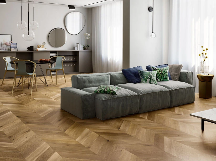 La posa a spina ungherese, molto attuale e di tendenza, rende questo legno particolarmente raffinato e richiama i parquet tradizionali più eleganti.