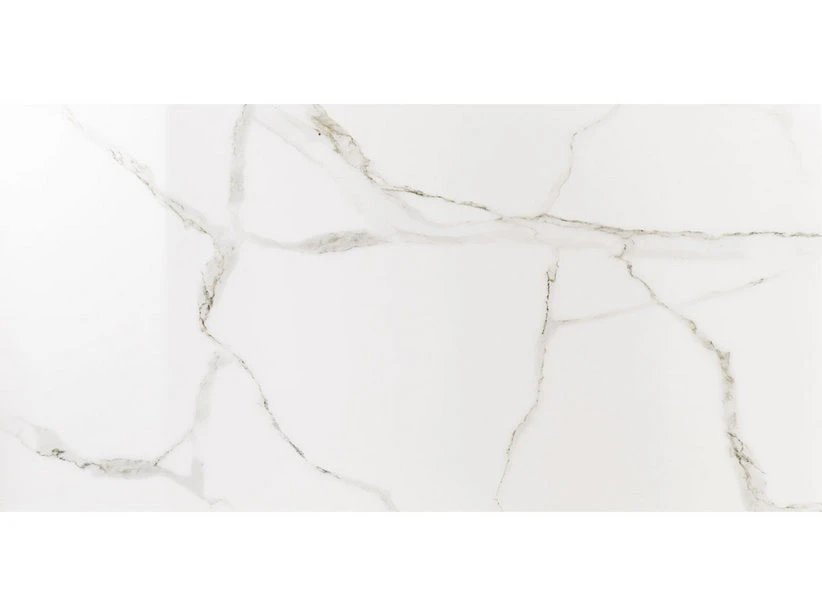 Piastrella in gres porcellanato rettificato, formato 60×120. Le venature e le sfumature del marmo Calacatta, ottenute mediante processi di stampa digitale, risultano evidenziate dalla superficie lucidissima.