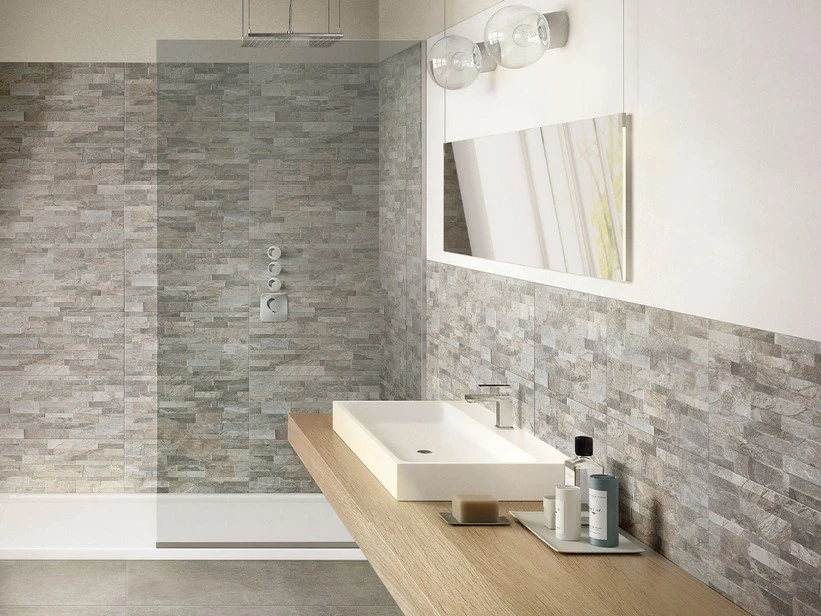 Mattonella da rivestimento in gres porcellanato, con superficie tridimensionale che riproduce l’effetto di un muretto in pietra composto da diversi elementi di quarzite accostati fra loro.
