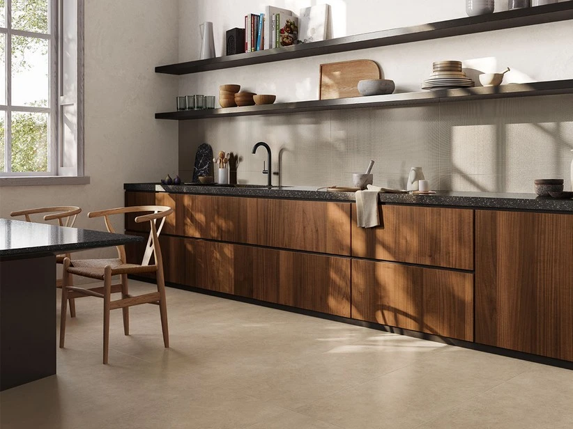 Slim Beton Taupe riproduce l’effetto di una superficie in cemento o in resina: sfumature delicate tono su tono danno movimento alla superficie liscia e opaca. Il colore di base è un tortora caldo ed elegante. Un fondo neutro ma dalla spiccata personalità, perfetto per progettare ambienti contemporanei, che può essere abbinato a moltissimi prodotti Iperceramica: gres effetto legno o pietra, parquet, decori di ogni stile e colore.