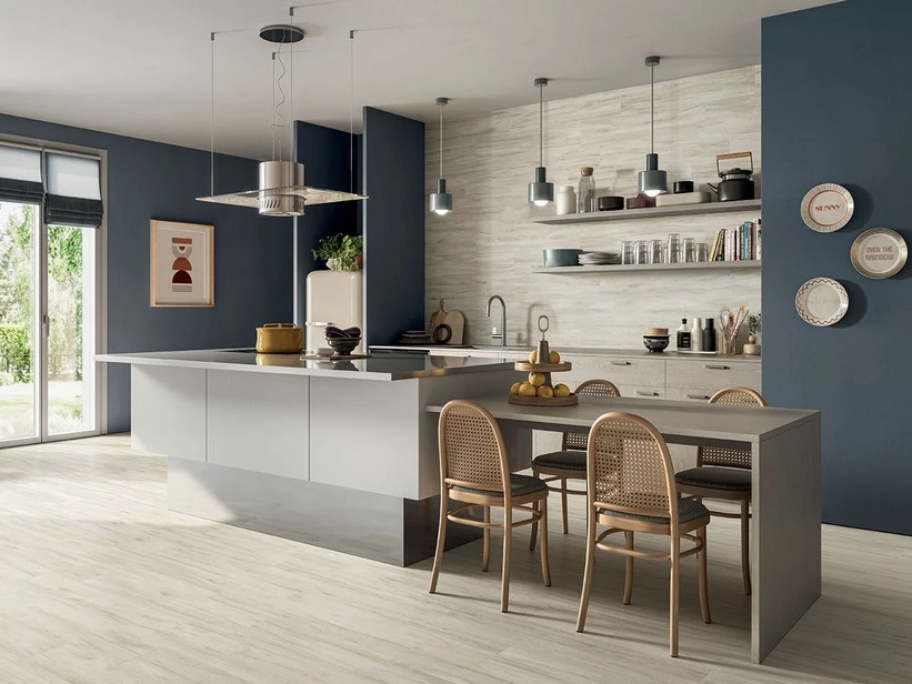 Slim Wood White riproduce l’effetto del legno con grande ricchezza di particolari: le venature e i nodi tipici del rovere rendono questo materiale particolarmente realistico e versatile, facile da abbinare a superfici diverse quali gres effetto pietra o cemento e piastrelle decorate. Il colore è un tono caldo di bianco panna, luminoso, ravvivato da sfumature tortora e avorio. Una piastrella versatile, perfetta per progettare ambienti caldi ed accoglienti dal gusto contemporaneo.